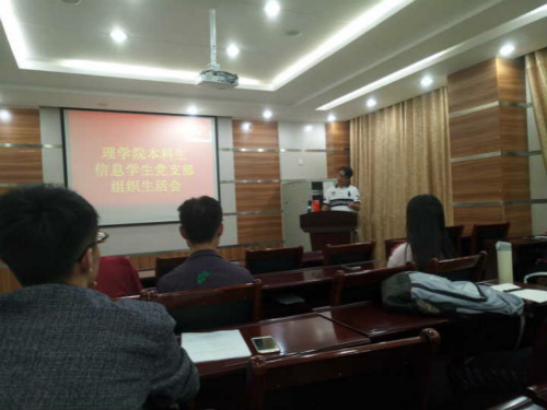 会议由本科生信息党支部指导老师汤斌飞主持召开。会议开始,汤斌飞向我们传达了本次会议的主要内容。针对本支部内的积极分子,他提出身为入党积极分子要发挥在班级内部的先锋模范作用,坚定信念,帮助有困难的同学。紧接着,汤斌飞讲解了刘珂同志在学校第十一次党代会上的报告,总结了我校在十二五规划期间的诸多成就,让大家感受到了前辈们的辉煌的奋斗史。最后,汤斌飞介绍了学校十三五规划的各项工作指南,同时对学生党员提出了明确的要求。