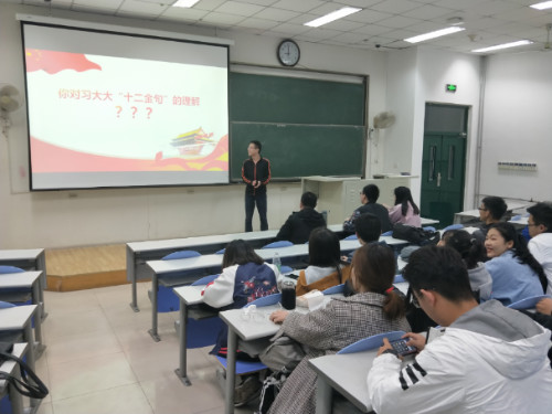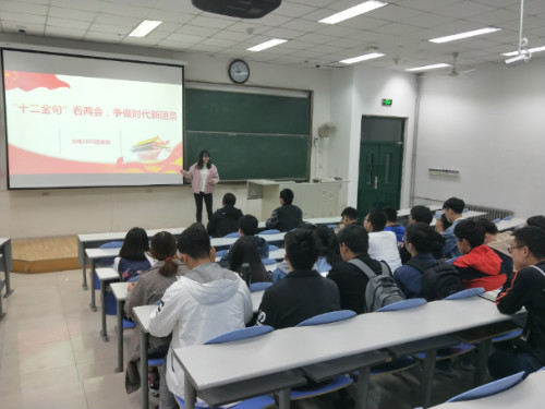 会议伊始,刘雨璇带领全体团员观看两会相关视频,随后她就习近平所说的“十二条金句”的含义及其同当代大学生和共青团员之间的联系进行讲解,促进支部成员对党和国家工作重点的了解,让团员们全面了解两会精神。最后,刘雨璇就“你对十二金句的理解”和在场的同学展开交流。入党积极分子郝宇川说:“‘十二金句’令人为之振奋,让国家的魄力深入人心,同时也提醒我们大学生做好准备,随时为国家贡献力量!”