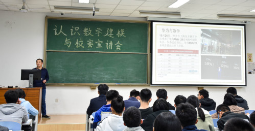 活动伊始,主持人张利振介绍本次宣讲会的目的,是使大学生掌握专业知识和数学理论与方法、提升分析和解决问题以及计算机知识和运算能力;同时,培养广大同学对科技活动的兴趣,以此提高学生的综合素质,拓展知识面,培养创新和团队合作精神。随后指导老师陈华以“华为与数学”为开端向同学们介绍了全国大学生数学建模竞赛和美国大学生数学竞赛,并通过举例让大家更加深入了解数学建模。活动中,陈华结合自己的经验,对数学建模的过程、应用、预备知识以及论文撰写做了一一介绍。他道明了参加数学建模比赛所需条件和需要提前准备的工作,对本次校赛的竞赛方式与具体内容也做出解答。最后,陈华强调参加数学建模比赛要先打好基础,不应该好高骛远。同时他对同学提出期望,希望大家在本次校赛中,能通过查阅问题,分析问题,解决问题来锻炼自己提升自己。“通过这次宣讲会,让我对数学建模有了更深入地了解,也对参加比赛充满信心。”活动结束后信息与计算科学专业李天娇同学说道。