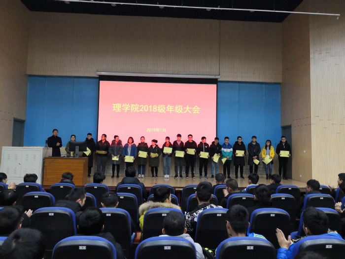 1月11日,必威2018级期末年级大会于南教100举行,2018级辅导员陈银吨和薛瑞琪、研究生辅导员田方和全体2018级学生参加本次大会。