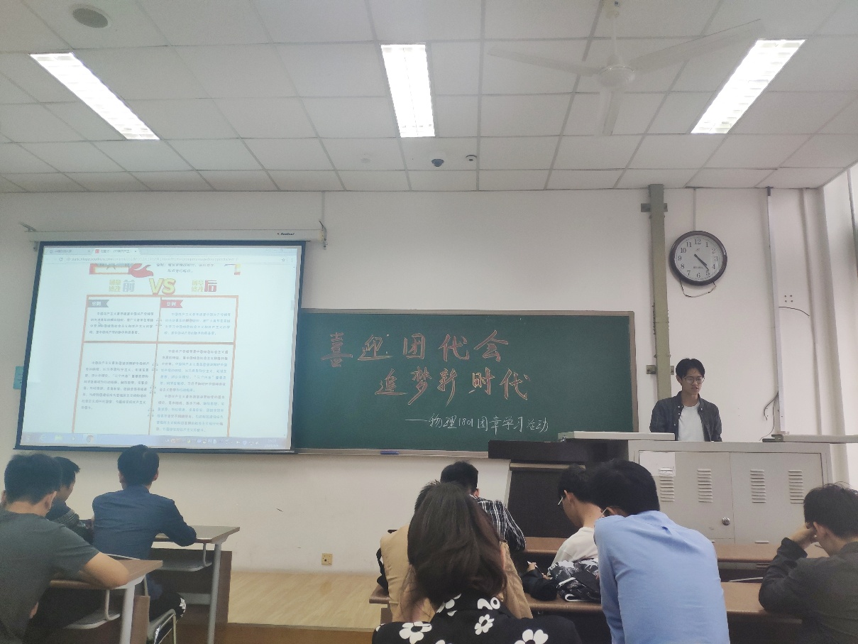 活动伊始,耿志轩带领全体成员学习了《中国共产主义青年团章程》,并就团章修正案与原团章对比进行逐条解读,深入分析,还细致讲解了“去四化”和“三会两制一课”的具体内容。随后耿志轩向到场学生提出有关团章程的问题,学生们积极回答,并关于对团的解读进行了深入交流。其中,应用物理1801班赵运龙认为,“团章的变化是我们身为共青团员必须要深入学习和了解的,只有真正了解党章,才能称得上是真正的共青团员。”提问环节结束后,耿志轩对此次团日活动进行总结,向全体学生提出要在行为层面和思想层面承担作为共青团员的责任和义务,并且为加入共青团这个伟大的组织而由衷的骄傲。