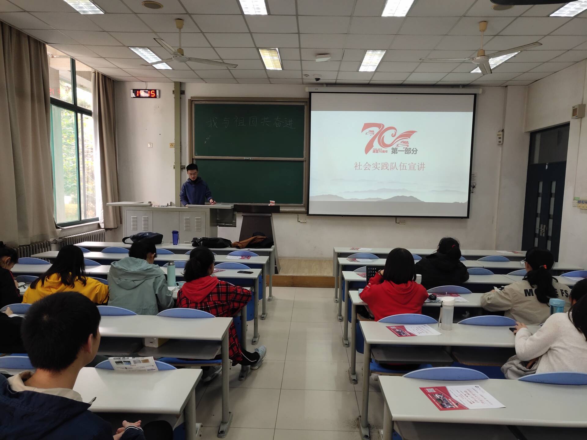 为庆祝中华人民共和国成立70周年,提高学生的爱国热情,10月25日下午,数学1801班全体学生于南堂117室举办“我与祖国共奋进”团日活动。本次活动由数学1801班团支部书记杨继辰主持,数学1801班全体学生参加。
