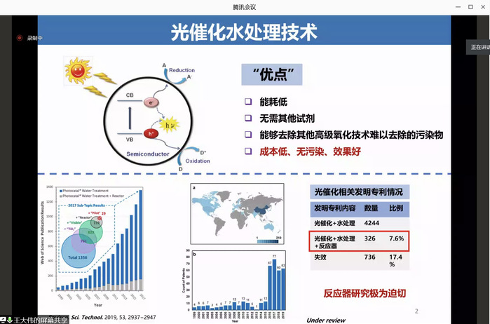 本次学术报告中,王大伟主要介绍了光催化水处理技术方面的应用研究。首先,王大伟为大家讲解了光催化水处理技术的优点,其主要有能耗低、无需其他试剂、能够去除其他高级氧化技术难以去除的污染物、成本低无污染效果好这几项优点,所以基于这一现状研究反应器极为迫切。接着,王大伟介绍了几种光催化水处理反应器,并总结了光催化水处理的优势在于降解其他高级氧化技术难以去除的物质。最后,王大伟汇报了光催化水处理的应用探索,其中重点讲述了一种名为“Photo-cat”的水净化系统,该技术的优势在于流速大,催化剂碰撞激烈,因而降低了处理效果对光催化表面性质的依赖。