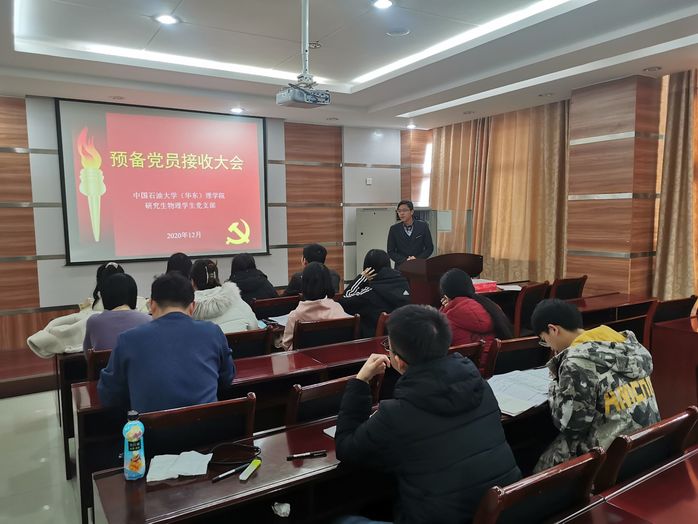 会议伊始,王辉同志介绍了预备党员接收大会的具体流程。首先,按照大会议程,焦瑞云等4名发展对象向大会汇报自己对党的认识、入党动机、本人履历、现实表现等各方面的情况,明确表达了对入党的迫切愿望。其次,其入党介绍人根据前期对发展对象的了解对被介绍人的学习、工作、实践活动等方面阐述相关的考察意见,孙淑怡同志代表支委会向大会介绍发展对象的培养考察意见及政审情况。会议严格按照流程逐一讨论了本次4名发展对象的入党问题。随后,经过与会党员充分讨论,以无记名投票的方式表决,一致同意接收焦瑞云、李双、杨金伟、李鑫4名同志为中共预备党,并提交学院党委会审批。接着,党支部书记王辉同志讲话。他要求这4名发展对象,继续以党员的标准严格要求自己,不忘初心、牢记使命,不断加强政治学习,提高道德品质,争做合格的共产党员;思想上,永远保持先进性;行动上,永远保持积极性;品质上,永远保持纯洁性;以党员身份为他人树立标杆,严格规范自己,提高政治文化修养。