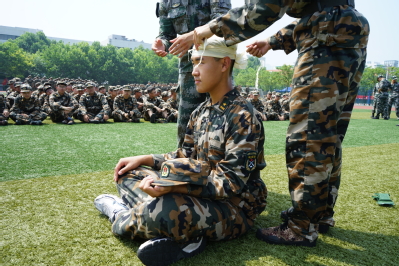 上午,同学们复习了正步走动作要领,经过反复练习,同学们有了很大进步,已经能够在踢腿时稳住身体。休息间隙,教官给同学们传授救护包扎的基本知识,并让同学们自己尝试给同伴包扎。