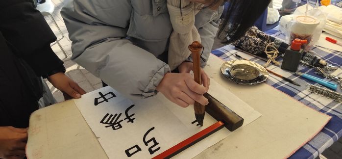 为了大学生综合素质和文化素养与创新创业、助贫事业有机结合,团支部联合书画社部分成员,进行线下书法表演。团支部书画社成员闵婉茹、赵飞颖同学通过现场书法,吸引校内师生驻足观看。“弘扬中华美德,援手助贫脱困”几个大字力透纸背,彰显了团支部成员朝气蓬勃的美好形象,同时体现了团支部成员以创新创业助贫科左的初心和决心。