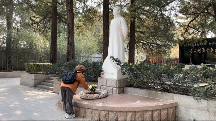 第二天,实践队来到了李大钊烈士陵园,尽管冬日草木凋敝,实践队员依旧满怀敬意。陵园门口是一尊汉白玉雕像——他就是中国共产主义运动的先驱、中国最早的马克思主义者、中国共产党的创始人之一的李大钊。这座全高2米的李大钊烈士雕像昂首挺胸,背负双手,儒雅质朴,和蔼中透着百折不回的刚毅。