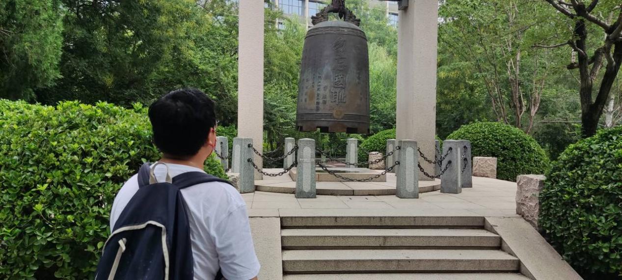 接着实践队员们来到一个大钟前,钟上刻着“勿忘国耻”四个大字,记录着五三惨案的故事,借此告诫人们警钟长鸣,勿忘国耻。
